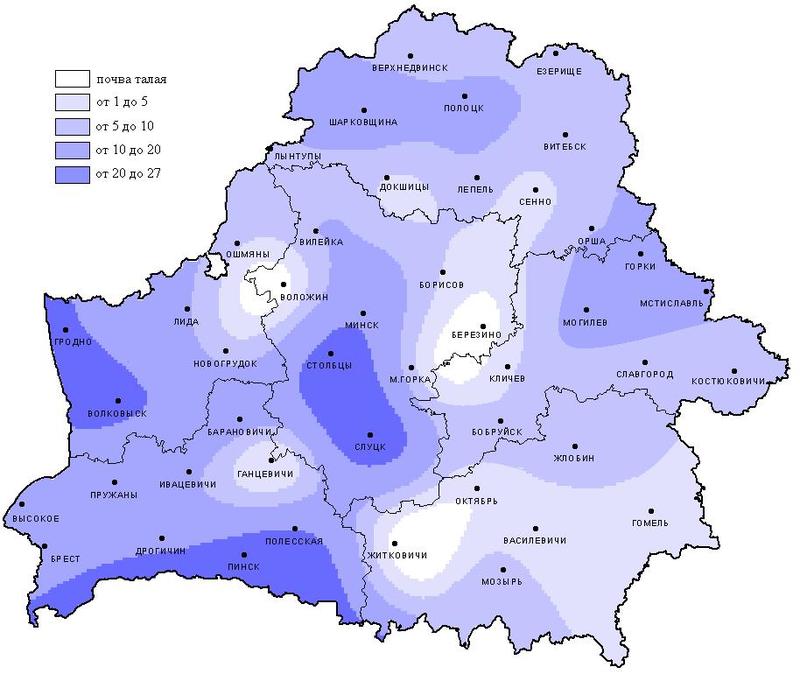Лишь в некоторых районах на юго-западе Беларуси земля промерзла на глубину более 20 см.