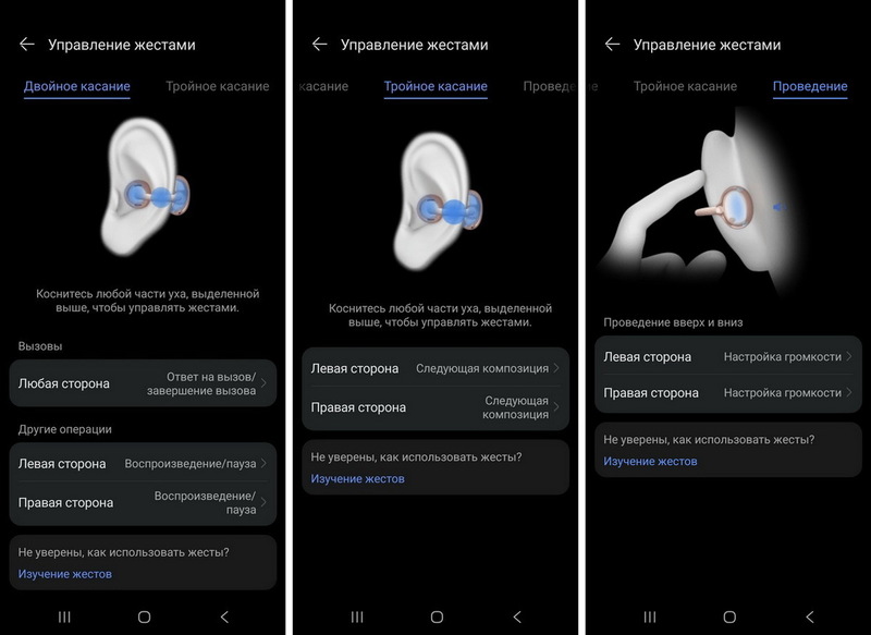 Громкость регулируется свайпом по выступающему элементу в форме фасолины. Проводишь вверх – звук становится громче, вниз – тише. Здорово, что не нужно искать какую-то кнопку или управлять через смартфон. А жесты можно менять в приложении AI Life, если хочется, чтобы, скажем, двойной тап не ответил на звонок, а включил голосового помощника.