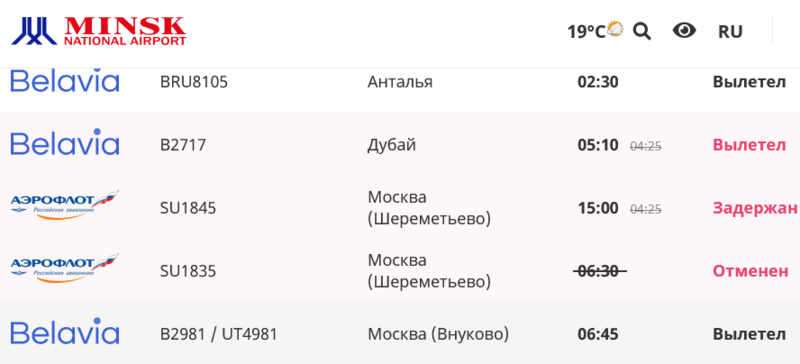 На онлайн-табло Национального аэропорта Минск можно видеть, что отменены рейсы SU1834 прибытием в Минск в 01:45 (сначала его перенесли на 03:55, потом вовсе отменили) и SU1842 прибытием в 13:45.