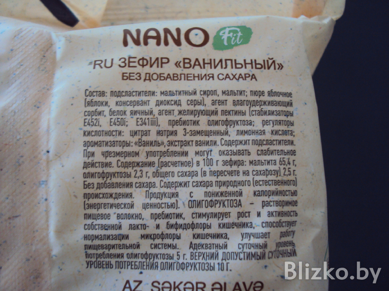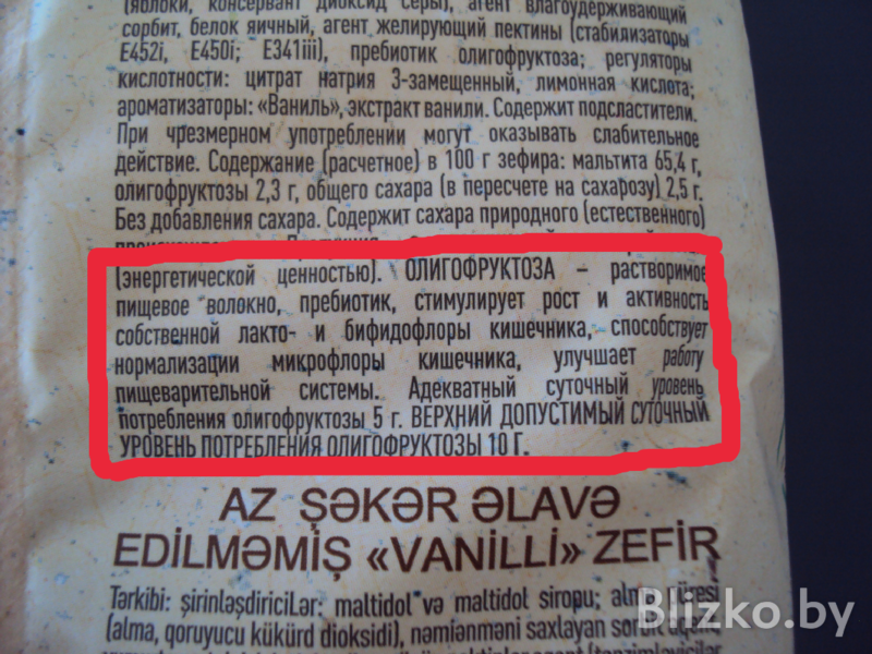 На упаковке, справедливости ради, есть предупреждение о суточном потреблении. Правда, чтобы понять количество зефирин, которое стоит съесть, чтобы не провести полдня в клозете, придется заняться математикой. На оборотной стороне есть информация, что суточная норма потребления олигофруктозы — 5 грамм, верхняя граница — 10 грамм. В 100 граммах продукта содержится 2,3 грамма олигофруктозы. Ее суточная норма 5 грамм, а значит в зефире это 217 граммов или почти одна полная пачка. Если быть точными, то 5,5 зефирины.