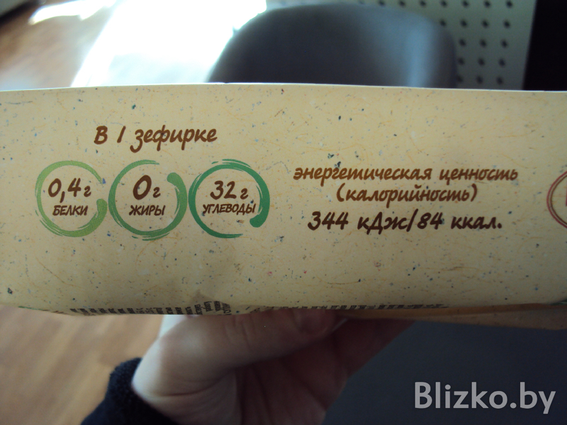 А вот энергетическая и пищевая ценности указаны. В одной зефирке содержится 0,4 грамма белка, 32 грамма углеводов и никаких жиров, 344 килоджоулей и 84 килокалории.