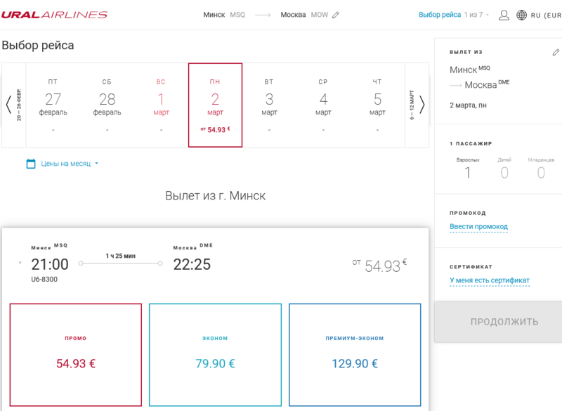 Из Минска в Москву (тоже Домодедово) рейс со свободными билетами нашелся только один: 2 марта. Билеты стоят от 55 евро (186 белорусских рублей).