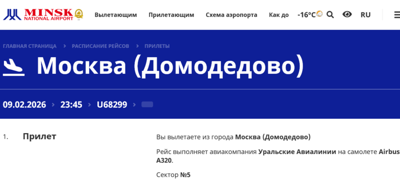 Самолет «Уральских авиалиний» сегодня поздно вечером прилетит из Москвы (аэропорт Домодедово) в Минск.
