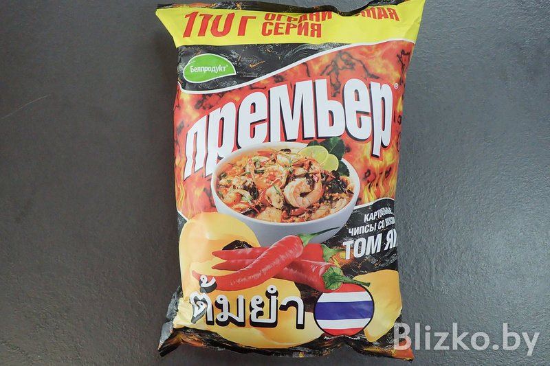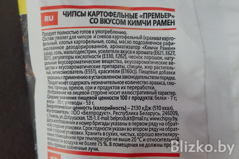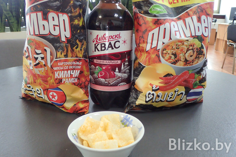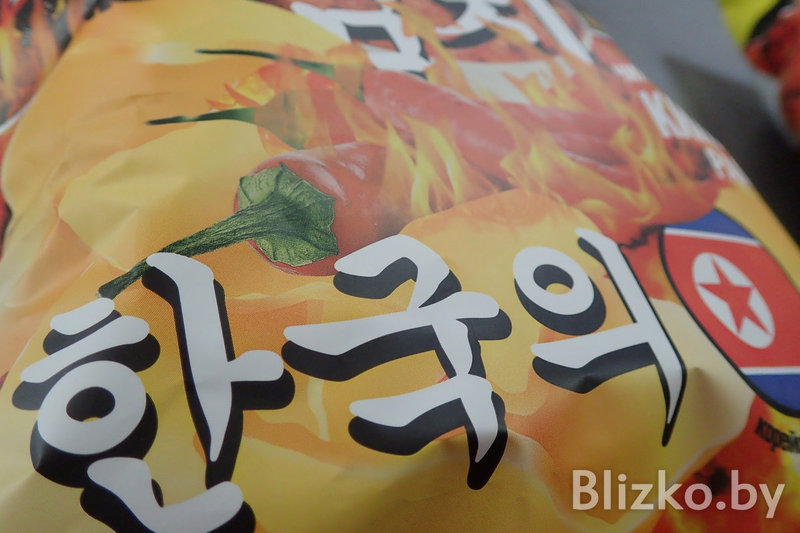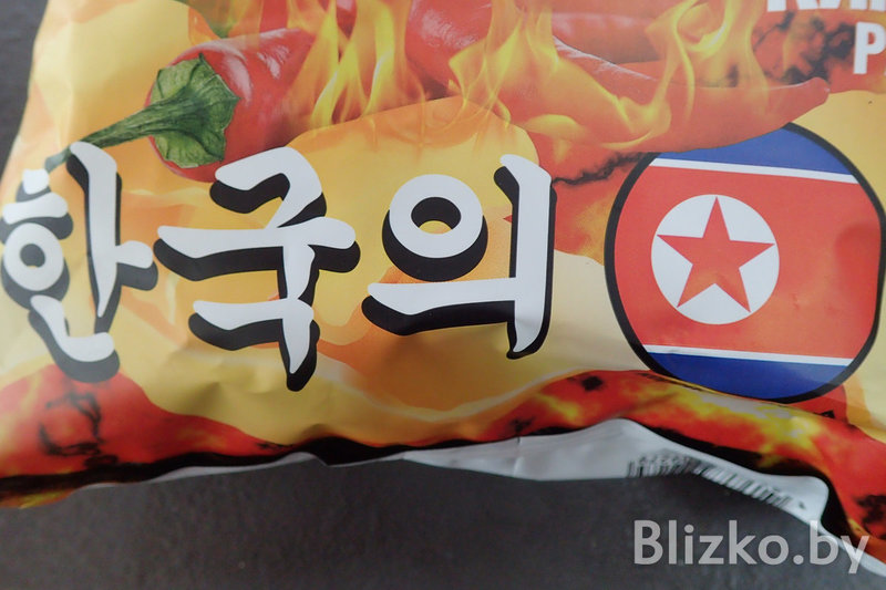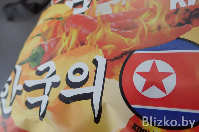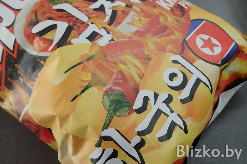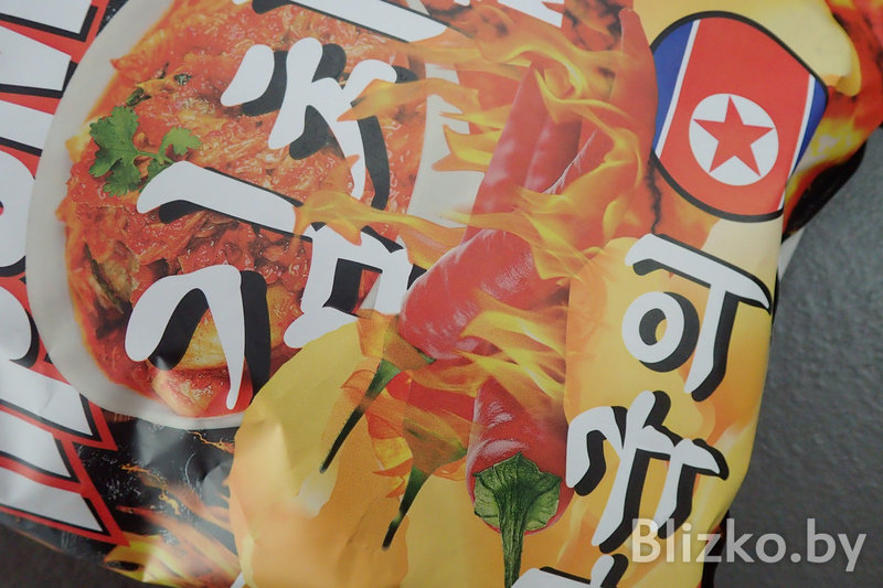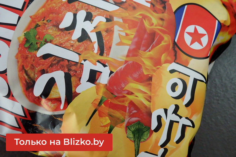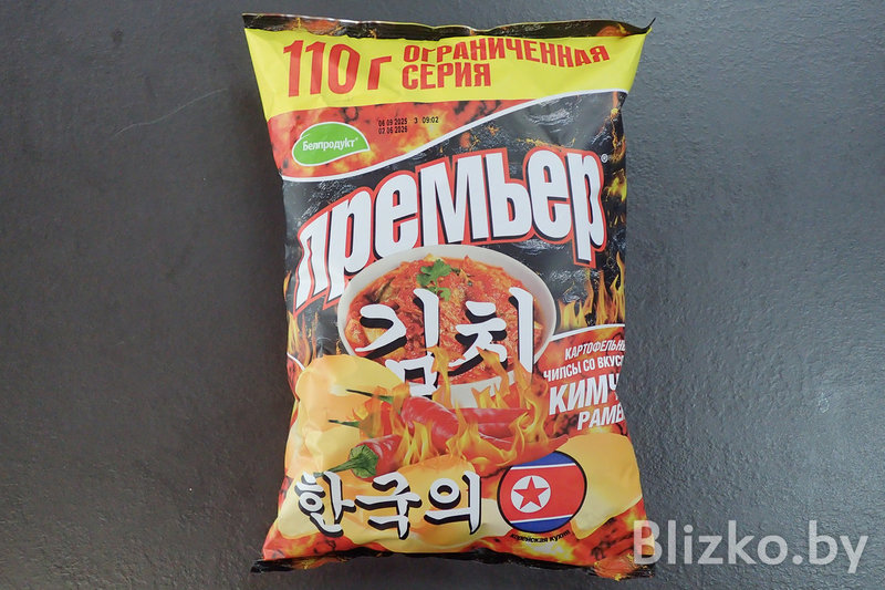 Да, вот они, настоящие белорусские чипсы «Премьер» (сделано в Гомеле) с флагом КНДР и вкусом «ким-чи рамен».