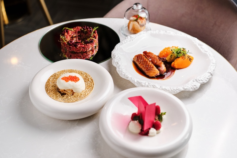 Баоцзы с уткой чар-сю, соусом гамадари, кремом фуа-гра и клубникой
