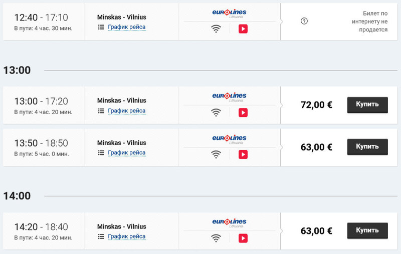 Видно, что на этом сайте многие билеты обходятся дороже, чем на сайте Infobus. Например, на «Инфобасе» два соседних рейса из Минска в Варшаву (в 20:30 и в 21:30) от компании «БайернТранс» и Автопарка №5 «Минсктранса» стоят 130 и 140 рублей соответственно. А у агрегатора «Юнитики» билеты на эти же автобусы стоят 238 и 174 рубля соответственно.