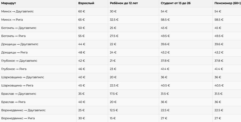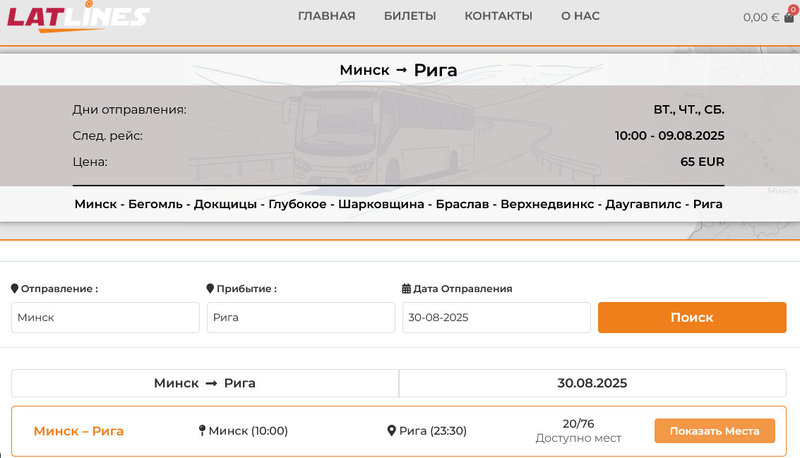 Латвийская компания LatLines выполняет рейсы из Минска и Гомеля в Ригу. Минский автобус идет через Глубокое и Браслав, а Гомельский — через Могилев, Оршу, Витебск и Полоцк. На сайте удобная «шахматка» с выбором мест на первом и втором этаже. Есть скидки для детей, студентов и пенсионеров, причем итоговая цена сразу видна на сайте на любой из международных отрезков полного маршрута (скажем, Шарковщина – Даугавпилс); приложения нет.