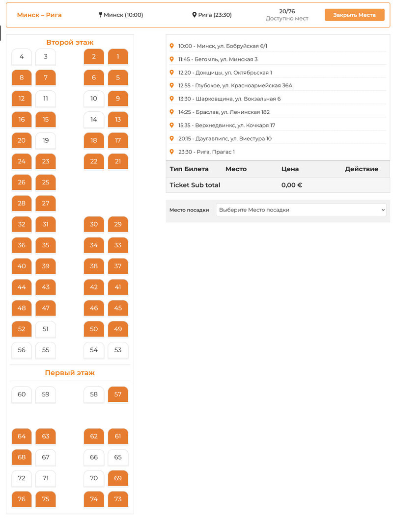 Система заказа билетов Ticketbus выросла из государственной системы, разработанной еще под эгидой Информационно-вычислительного центра авиации (да, авиации: просто так совпало). Сейчас именно на этом сайте показано расписание всех (или почти всех) государственных пригородных, междугородних и международных автобусных маршрутов. Здесь же есть и многие частники. Купить билет можно после регистрации в системе, выбор места — наугад (нет удобных схем автобусов с конкретным местом).