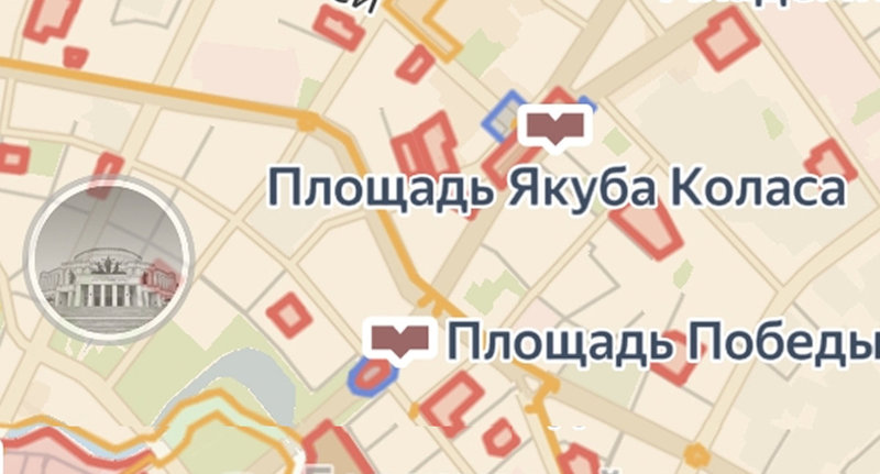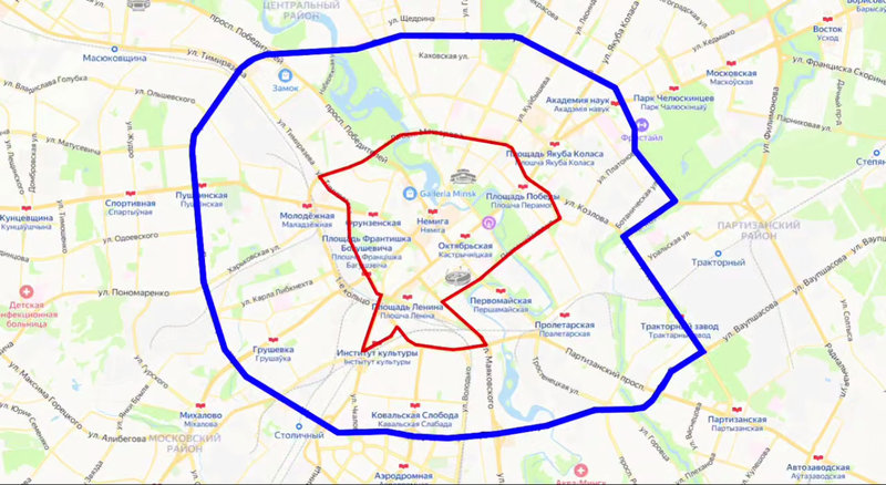 Оранжевая линия, ограничивающая территорию примерно от станции метро «Площадь Победы» до «Института культуры» по первой линии и от «Фрунзенской» до «Купаловской» по второй линии, показывает зону ограничения в 15 км/ч.