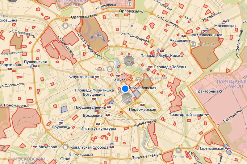 Голубым цветом отмечены зоны, где на самокатах можно ехать, но нельзя их припарковать (и, соответственно, начать поездку): это, например, фрагмент площади Независимости, площадь Победы, территория перед входом в парк Челюскинцев, места массового потока пассажиров у станций метро «Московская» и «Восток» и другие.