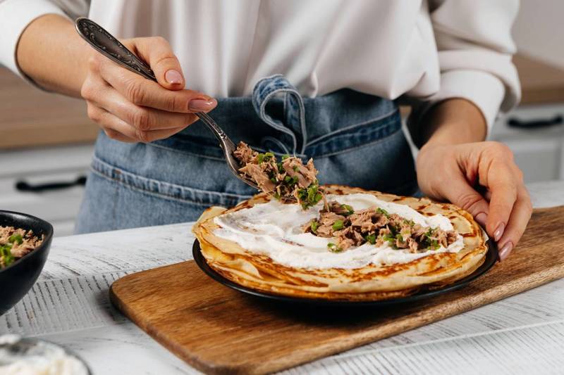 Речь идет о блинчике из кабачка с начинкой из тунца и сыра. Этот вариант отлично подойдет как для завтрака, так и для ужина.