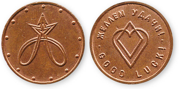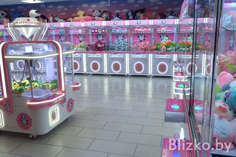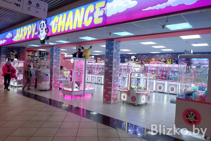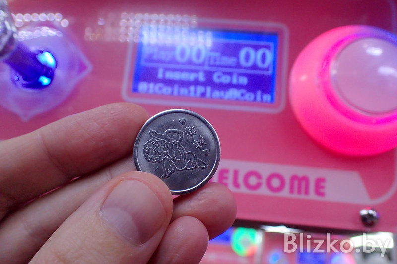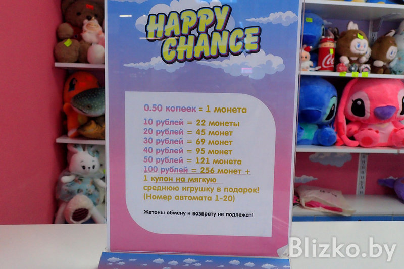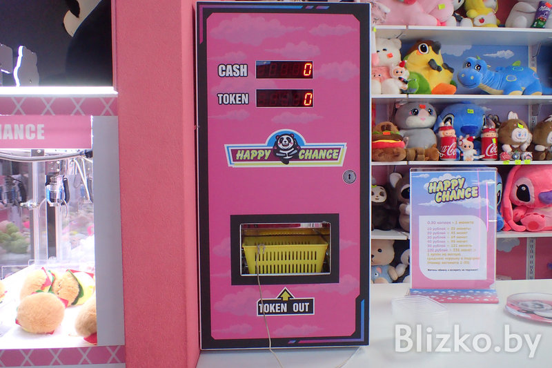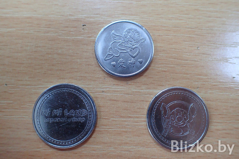 Например, в ТЦ «Титан» есть большая зона с названием Happy Chance. Здесь жетоны выдает специальный автомат, точнее, его лучше назвать полуавтоматом. Вы даете кассиру наличные или платите картой, он нажимает кнопку — и автомат отсчитывает вам нужное число жетонов. На жетоне с двух сторон нарисован ангел-купидон и два китайских иероглифа, означающих буквально «Амур». За одну монету можно получить право на одну игру на автомате (например, попытаться вытащить мягкую игрушку). При покупке нескольких жетонов действуют скидки.