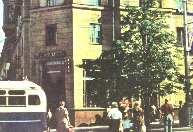В Минске существовало несколько закусочных-автоматов. Одна была в доме-«подкове» на площади Победы, другая — в магазине «под часами» напротив КГБ, там, где сейчас ресторан «Васильки». Вот на снимке из фотоальбома 1968 года видны надписи над входом: «Автомат. Соки, воды». В этих закусочных-автоматах посетители покупали в кассе жетоны, а потом «скармливали» их автоматам с закусками и напитками. Где-то надо было опустить один жетон, где-то — два, — в зависимости от стоимости самого блюда.