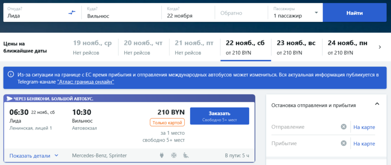 Перевозчик «Атлас» тоже начал продажу билетов в Литву, у них можно найти вариант через пункт пропуска Бенякони. Например, на 22 ноября из Лиды в Вильнюс за 210 рублей. Перевозчик предупреждает: из-за ситуации на границе с ЕС время прибытия и отправления может измениться.
