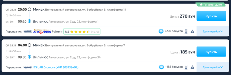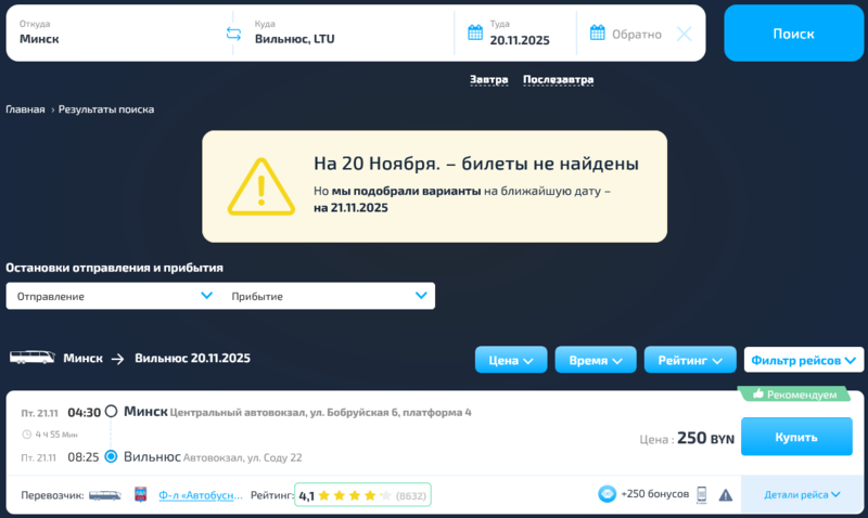 Blizko.by нашел в продаже билеты из Минска в Вильнюс на 21 ноября 2025 года по 250 рублей; на более поздние даты можно найти билеты и подешевле: например, на субботу 29 ноября можно купить билет за 185 рублей. Эти автобусы идет через пункт пропуска Каменный Лог.
