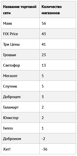 Согласно данным торгового реестра, в лидерах по приросту числа магазинов за 2024 год: «Маяк», FIX Price, «Три Цены», «Грошык» и «Светофор».