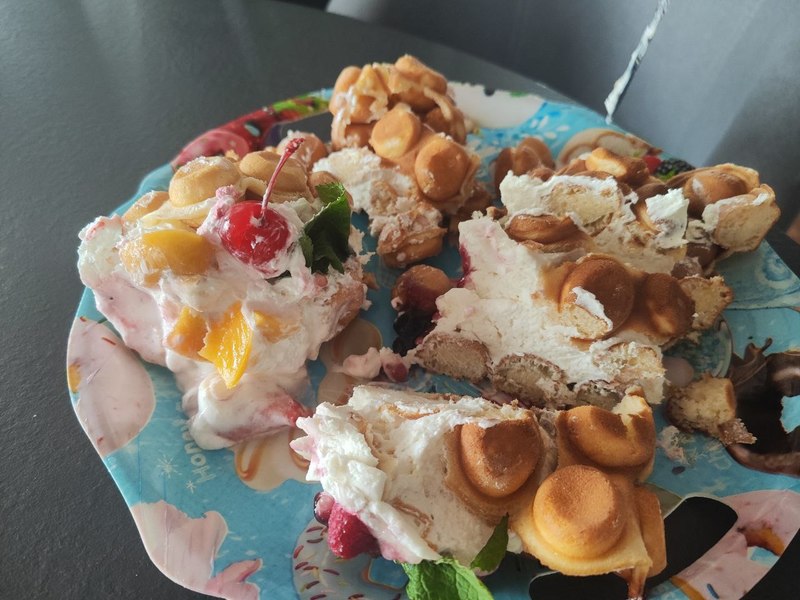 - Мне не понравились ягоды и фрукты. Они как будто перемороженные. Сделали из того, что было в морозильнике. Клубника как будто из компота достали. Крем ничего такой, сама вафля очень вкусная. Но есть все это неудобно.