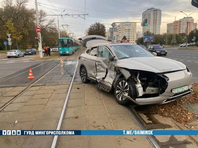 По предварительным данным, 62-летний водитель автомобиля BYD, двигаясь по Логойскому тракту, повернул направо на улицу Калиновского на запрещающий сигнал дополнительной секции светофора и столкнулся с двигавшимся попутно трамваем.