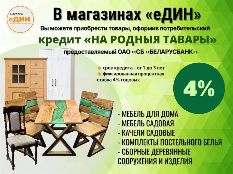Товары для приобретения в кредит можно выбрать в любом торговом объекте под брендом «еДИН». В основном, это домашняя и садовая мебель, постельное белье, изделия из дерева.