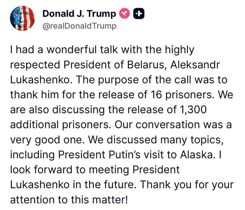 Наш разговор был очень хорошим. Мы обсудили многие темы, включая визит президента Путина на Аляску. Я с нетерпением жду встречи с президентом Лукашенко в будущем. Спасибо за ваше внимание к этому вопросу, — написал Трамп по итогам беседы с Александром Лукашенко.