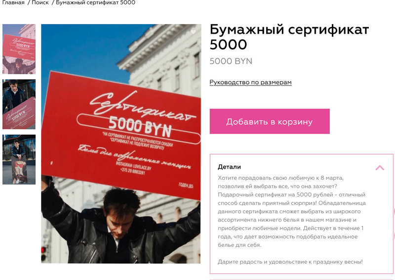 Магазин женского белья в Минске продает подарочный сертификат на очень большую сумму. В то время как большинство аналогичных магазинов предлагают сертификаты на 30, 50, 70, 100, реже 200, 300 и 500 рублей, этот решил не мелочиться.