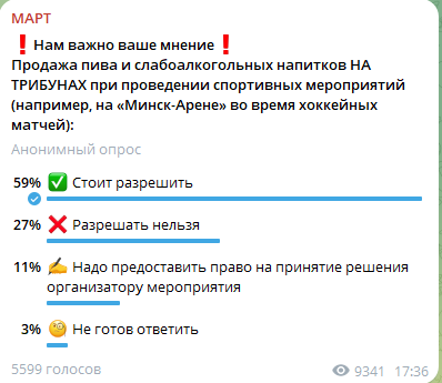 В качестве иллюстрации приводится пример «Минск-Арены» во время хоккейных матчей. На момент публикации в опросе приняли участие более 5 тысяч человек, и голосование все еще открыто для всех желающих.