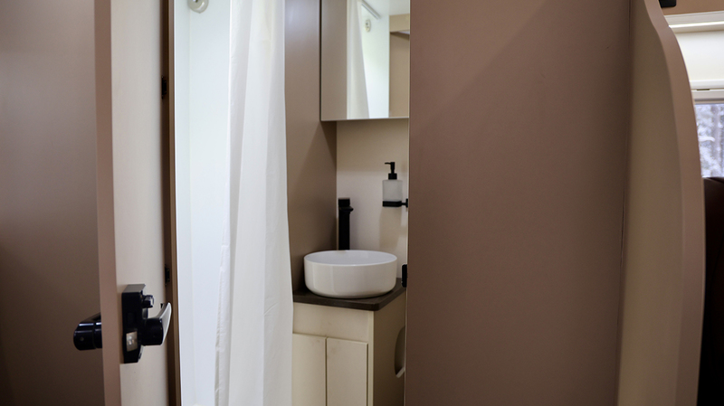 Для повседневных нужд оборудован полноценный кухонный блок и удобная обеденная зона. Существенным преимуществом транспорта стал отдельный санитарный узел с душевой кабиной, что редко встречается в автомобилях данного класса. Снаружи предусмотрены крепления для перевозки двух велосипедов.