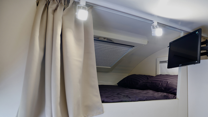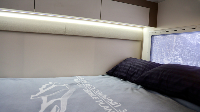 Интерьер кемпера организован по принципу компактной квартиры. Внутри предусмотрены две отдельные спальные зоны, рассчитанные на размещение четырех человек.