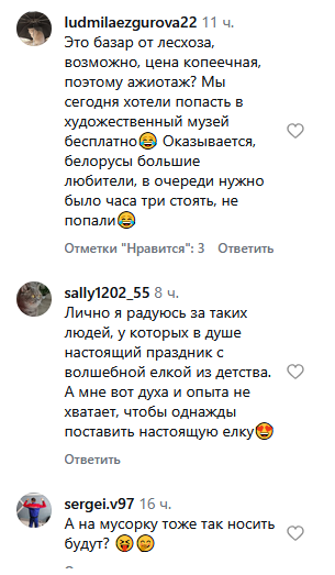 «В очереди за елками непременно нужно стараться порвать глотки конкурентам за мертвое дерево. Именно в этом и заключается атмосфера доброго зимнего праздника». «Дикари, будто дефицит этих елок».
