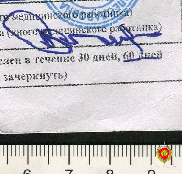 Милиционеры изъяли рецепт и направили на экспертизу. Выяснилось, что оттиск штампа с указанием учреждения здравоохранения и оттиск печати с данными врача – всего лишь изображения, выполненные способом струйной печати. Аналогичным образом была выполнена и подпись от имени врача с последующей обводкой пишущим узлом роллерного типа пастой сине-фиолетового цвета для шариковых ручек.