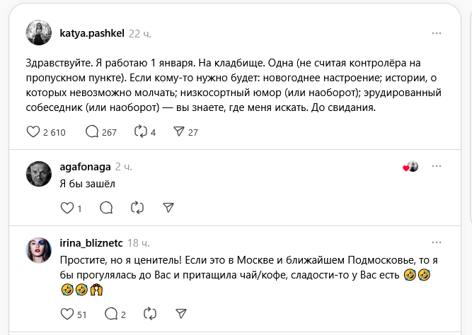 «Здравствуйте. Я работаю 1 января. На кладбище. Одна (не считая контролёра на пропускном пункте). Если кому-то нужно будет: новогоднее настроение; истории, о которых невозможно молчать; низкосортный юмор (или наоборот); эрудированный собеседник (или наоборот) — вы знаете, где меня искать. До свидания».