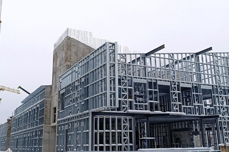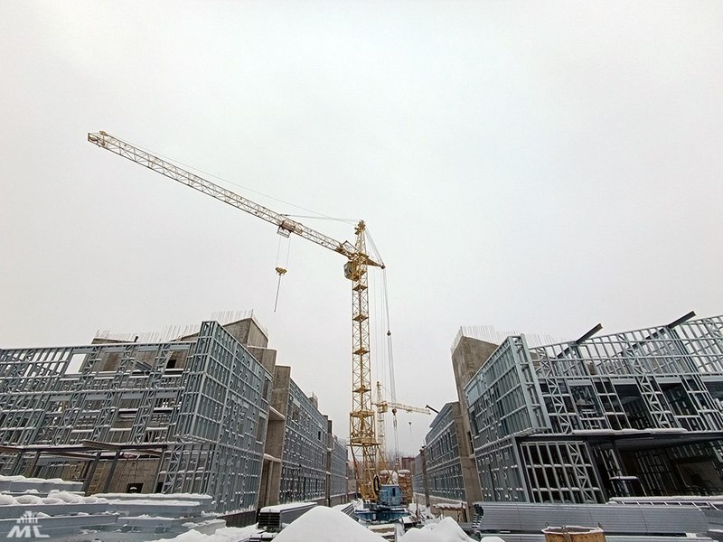 Из конструкций ЛСТК (лёгкие стальные тонкостенные конструкции) и монолитных вставок уже вырисовывается главный корпус. Работают два башенных крана и спецтехника.