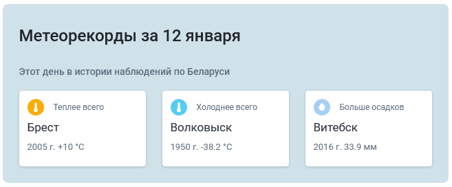 Температурные рекорды 12 января такие: холоднее всего было в 1950 году в Волковыске (-38,2°С), а теплее всего — в 2005 году в Бресте: +10°С.