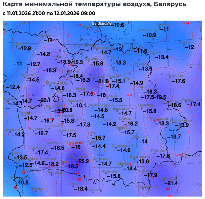 А что же прошедшей ночью? Как показывет график на сайте Белгидромета, холодне всего было в районе Лунинца: -25,2°С. В Докшицах было -21,8°С, в районе Ивья -20,8°С.