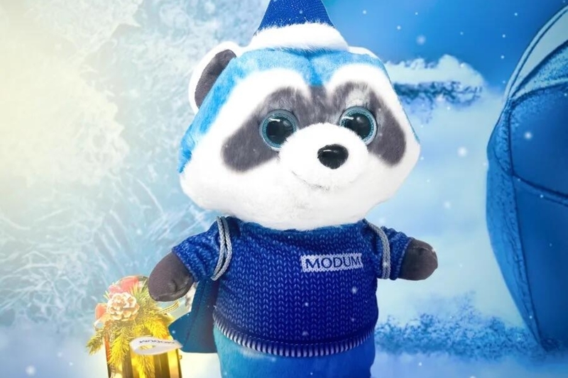 Игрушку зовут Модошик, он одет в синий вязаный свитер и праздничный колпак. При нажатии на живот, енот начинает «петь» популярную новогоднюю рекламную песню фирмы: «С Рождеством и Новым годом!»