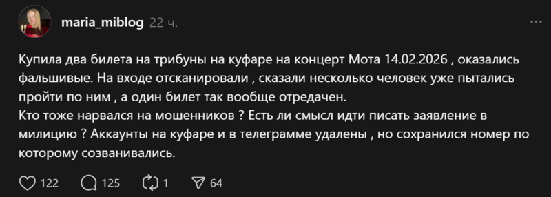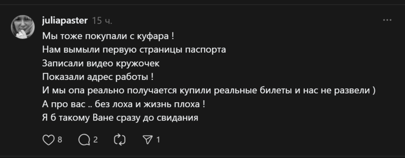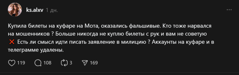 Как выяснилось в Threads, большинство псевдоперекупщиков действовали через Telegram или Куфар. Некоторые продавали настоящие билеты на одно место нескольким людям, другие действовали более изоощеренно — подделывали данные через графический редактор. В комментариях выяснилось, что пострадавших порядка 20-30 человек.