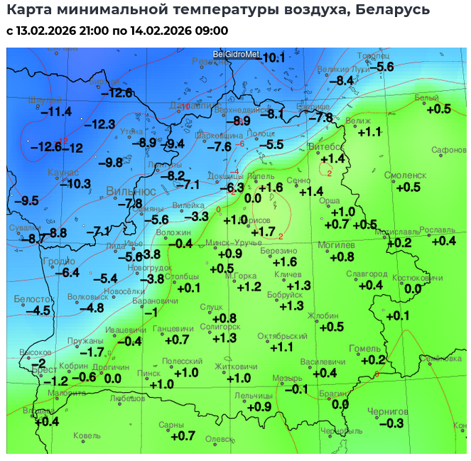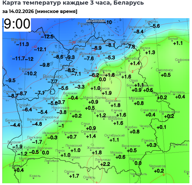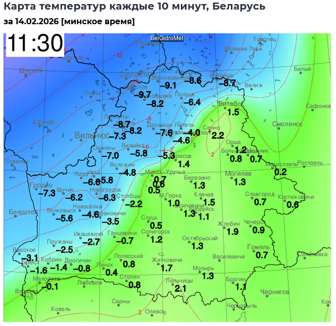 Перепад температур составляет почти 12 гралусов: в районе Браслава держится -9,7°C, но относительно недалеко и тоже в Витебской области уже +2,2°C№ выше 2 градусов тепла также в Жлобине и Лельчицах Гомельской области.