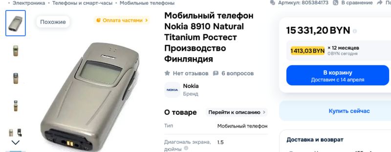 Или вот Nokia 8910: 15.331 рубль (5.252 доллара).