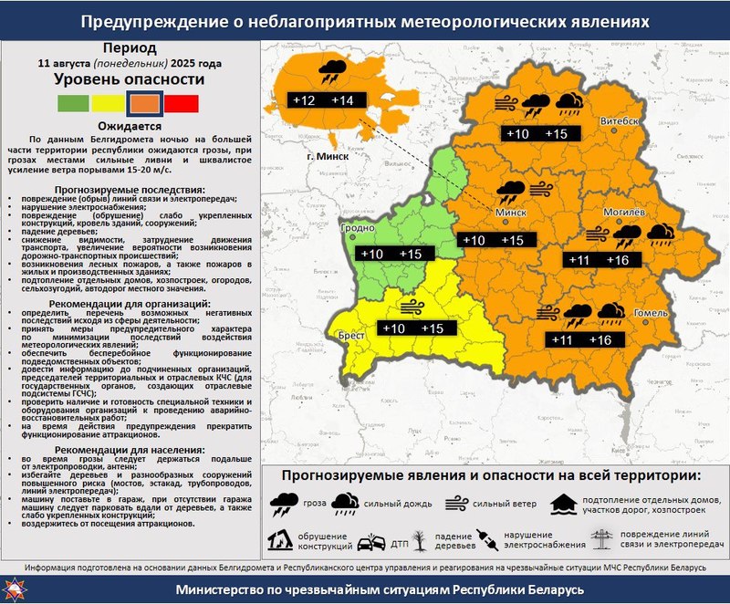 Днем 10 августа (воскресенье) на большей части территории республики ожидаются грозы, при грозах местами – сильные ливни и шквалистое усиление ветра порывами 15-20 м/с, по западу в отдельных районах 21-24 м/с. В г. Минске во второй половине дня 10 августа ожидается гроза, при грозе - шквалистое усиление ветра порывами 15-20 м/с.