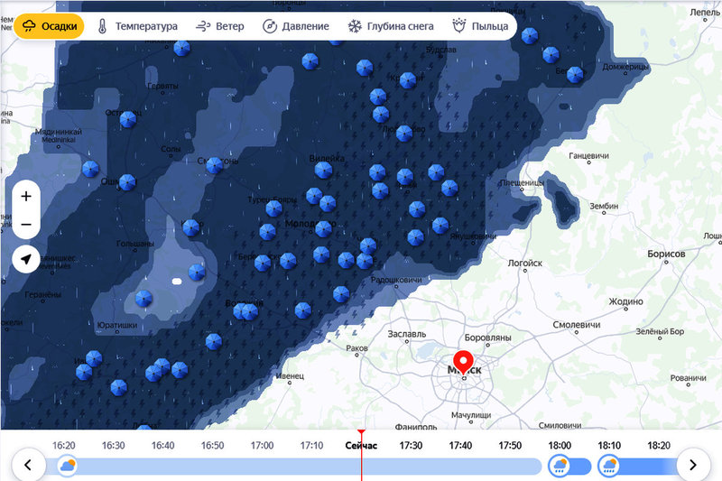 Согласно данным сервиса Яндекс.Погода, мощный грозовой фронт надвигается на столицу с северо-запада. Уже поливает в Молодечно, Воложине, Кореличах.
