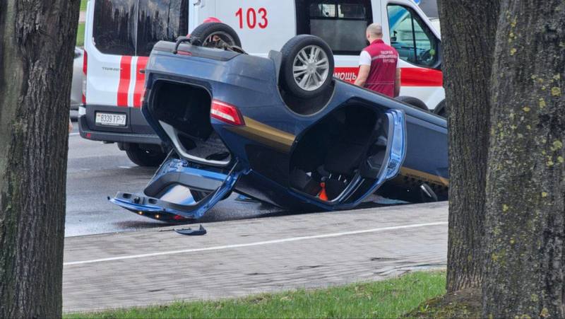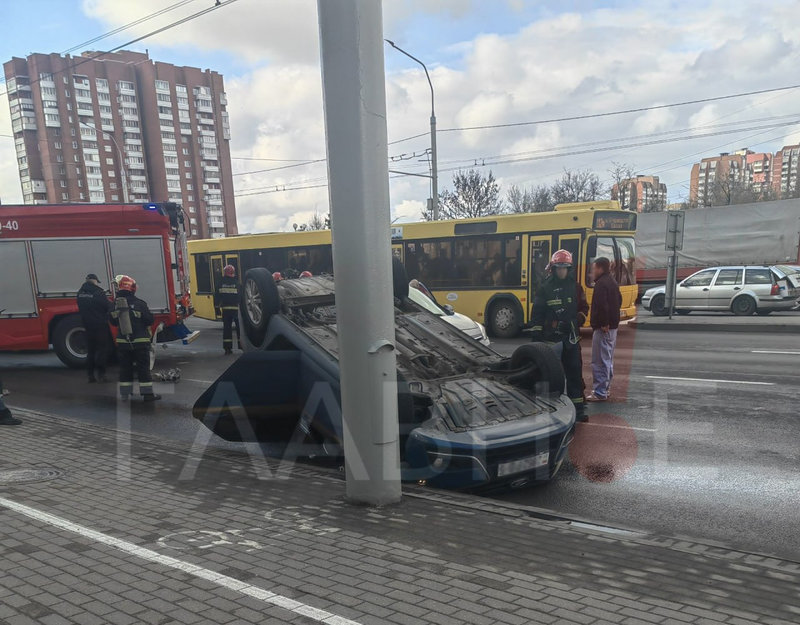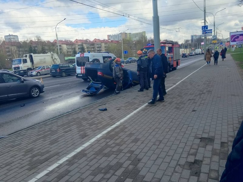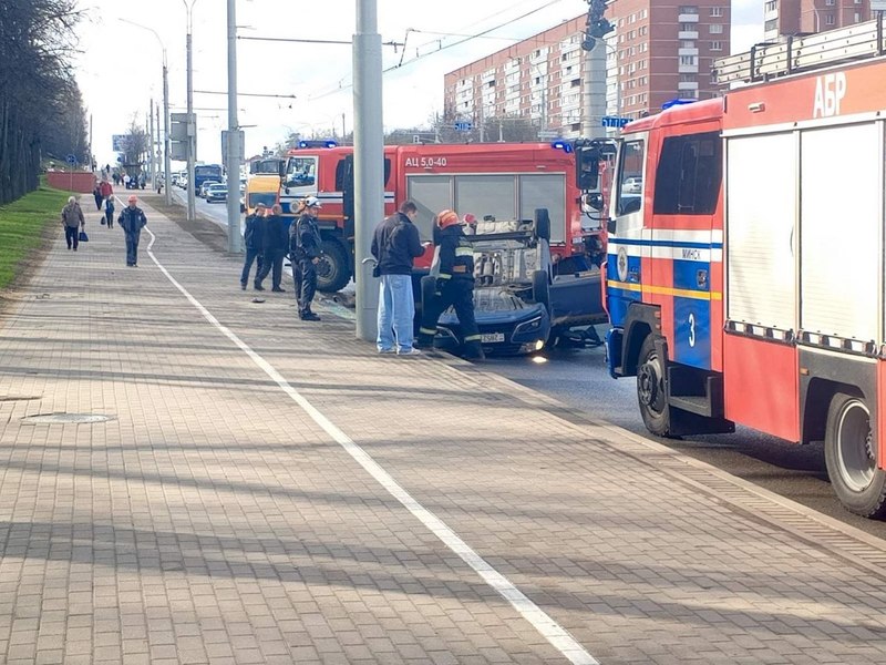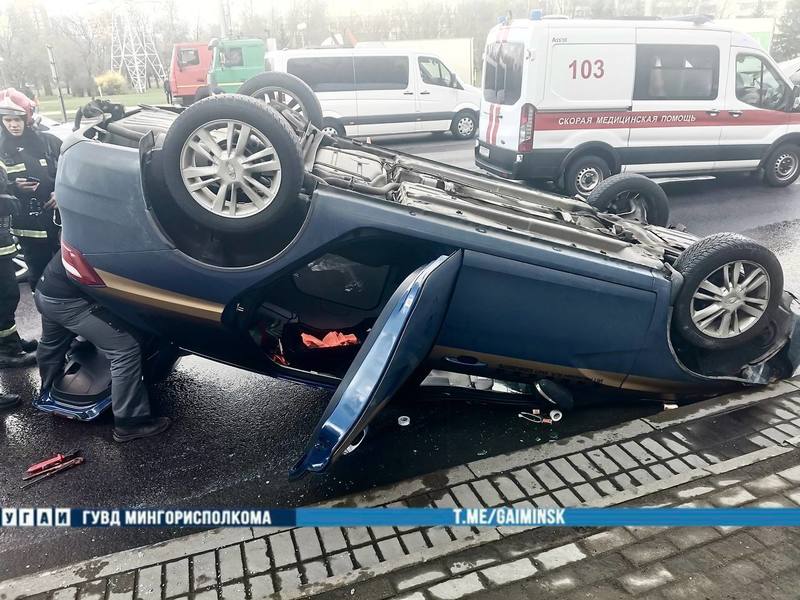 На Партизанском проспекте в Минске случилось ДТП: от удара другой машины перевернулся автомобиль такси.