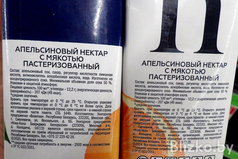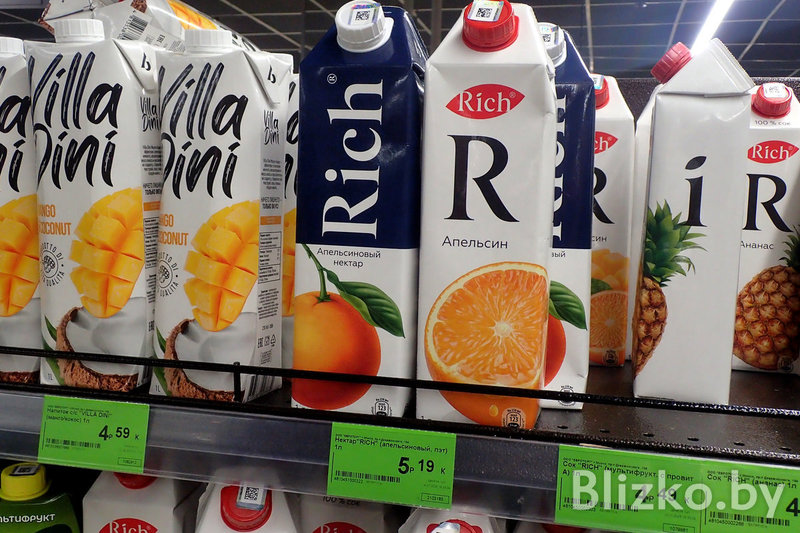 Весной Blizko.by рассказывал, что из магазинов пропал апельсиновый сок Rich. Вместо него появился апельсиновый нектар Rich. В чем разница? По белорусским стандартам, сок — это напиток, на 100% состоящий из выжатых ягод, фруктов, овощей. А нектар имеет объемную долю сока в 50% и меньше. Если сильно упростить, то можно утверждать, что нектар — это сок, разбавленный водой.