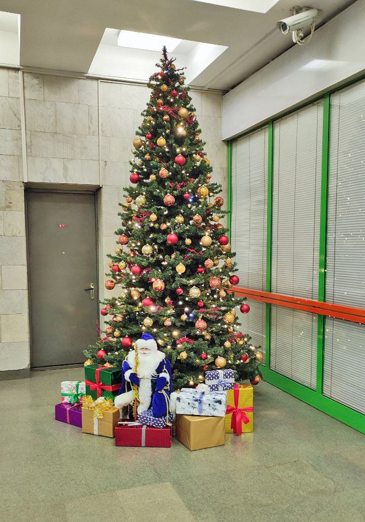 Елка очень высокая — практически упирается верхушкой в потолок. Праздничное дерево украшено шарами красного и золотистого цветов.