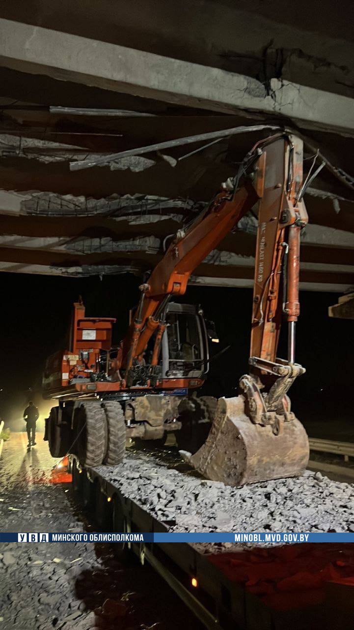 Водитель автопоезда (тягач Volvo и полуприцеп) при перевозке экскаватора не учел габариты транспорта. В итоге экскаватор стрелой своего ковша задел за мост и повредил сразу пять балок перекрытия.