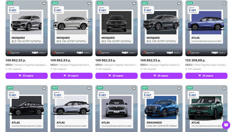 Все машины Geely и Belgee, представленные на Wildberries, гарантировано есть в наличии. На данный момент модельный ряд Geely состоит из кроссоверов Monjaro, Coolray, Cityray, Atlas, Okavango, седанов Emgrand и Preface, а также нового электрокара EX5. В линейку Belgee входят кроссоверы X50 и X70, которые представляют собой те же самые Geely, но с белорусским логотипом.