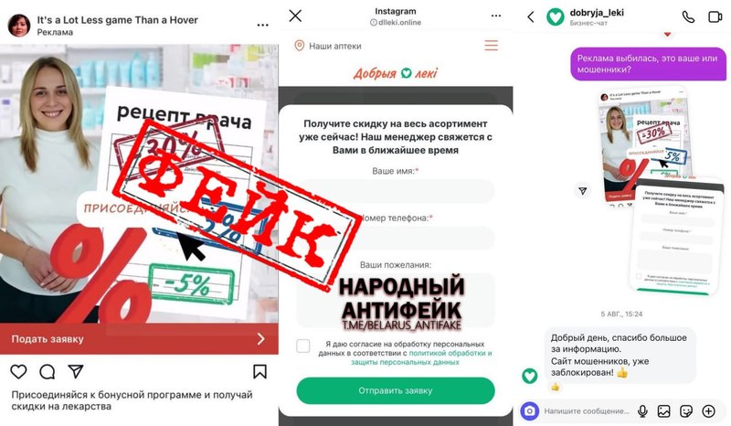 В интернете активно распространяется ложная реклама от имени аптечной сети «Добрыя лекі», в которой без стыда обещают скидки в 5%, 15% и даже 30% на весь ассортимент. Это мошенничество, нацеленное на уязвимые категории граждан — пенсионеров и людей, нуждающихся в лекарствах.