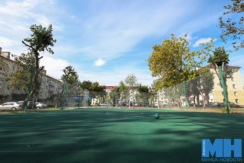 Следующая зона предназначена для любителей активных игр – площадка для мини-футбола. Ее покрытие выполнено из экологичных материалов с амортизирующими свойствами, а вся территория огорожена сеткой высотой в несколько метров, что исключает вылет мяча за пределы поля. Как отметила Татьяна Нестерович, ранее здесь уже существовала футбольная площадка, но ее решили усовершенствовать, заменив старую металлическую сетку-рабицу на более долговечную веревочную, обработанную специальными составами для устойчивости к погодным условиям и деформации от ударов мяча.