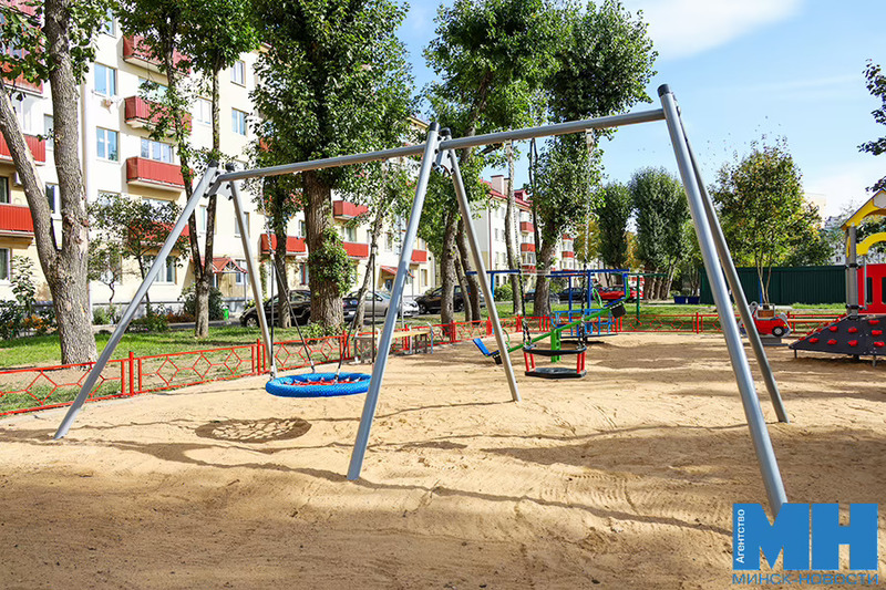 Для самых маленьких жителей обустроена игровая площадка с новым песочным покрытием, декоративным ограждением и разнообразным оборудованием, включающим игровой комплекс, горки, качалку-балансир, песочницу, качели с обычными и круглыми сиденьями, а также мини-карусель.