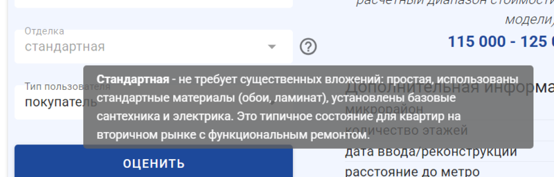 Единственное, что пользователи не могут поменять и в новой версии, — тип отделки жилья. Алгоритм использует стандартный тип для выведения стоимости, характерный для вторичного рынка.