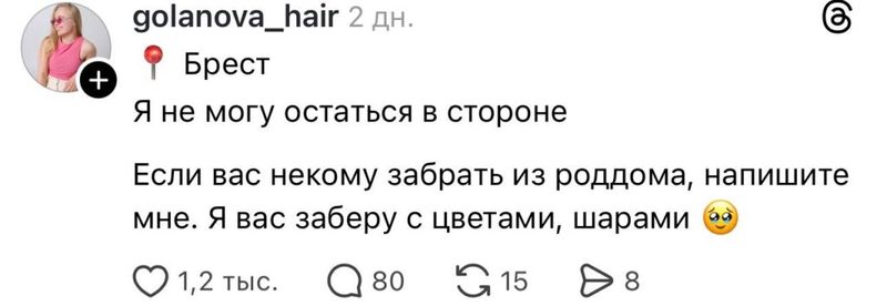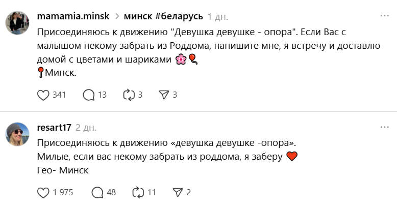 Тренд нашел отклик и в соцсетях белорусок: девушки из Минска и Бреста стали предлагать в соцсетях свою помощь одиноким матерям: встречать с выписки в торжественной обстановке с букетами цветов и воздушными шарами, делать фото на память. Нашлись и те, кто предложил вложиться в доброе дело финансово — например, оплатить букет, бензин или предоставить транспорт.